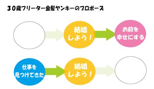 突然ですが、金髪フリーターのヤンキーが10年付き合っていた彼女にプロポーズする場面を思い浮かべてみてください(笑) A「お前のことが好きだ。お前と結婚したら正社員の仕事を見つけるし煙草もやめる。これからはお前を大切にいていこうと思う。だからオ…
